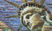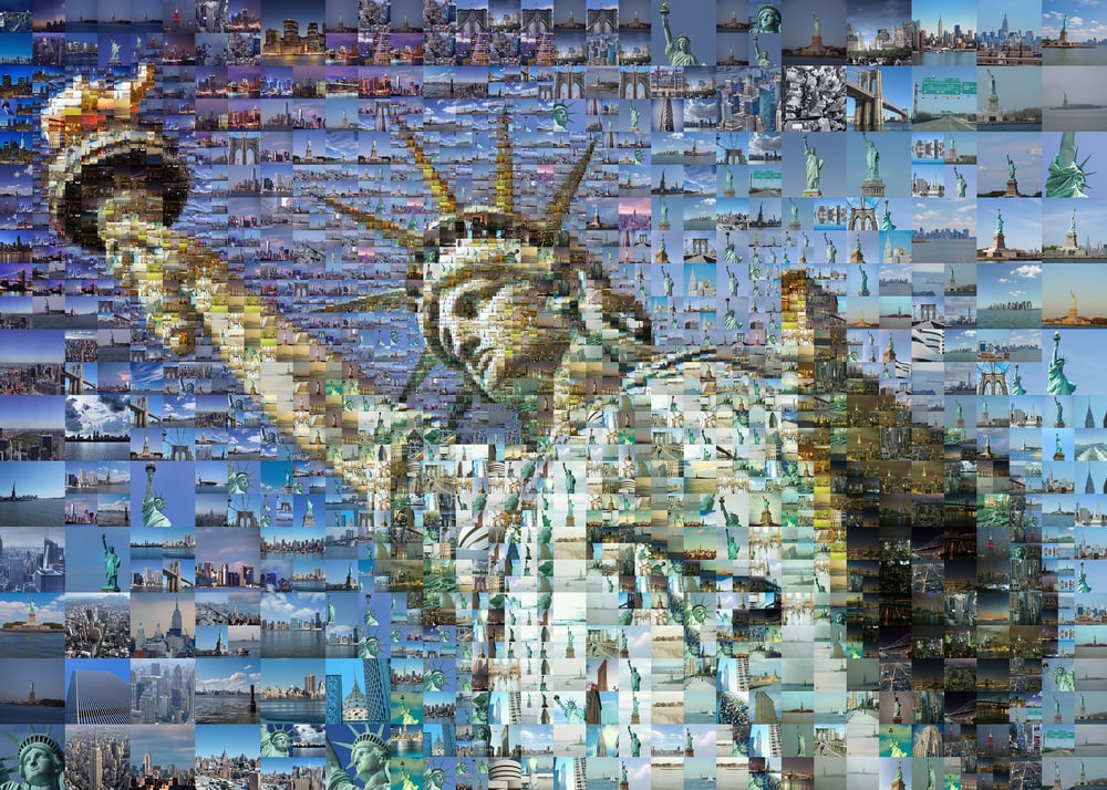 A mosaic artwork of the Statue of Liberty made out of photos of the city.