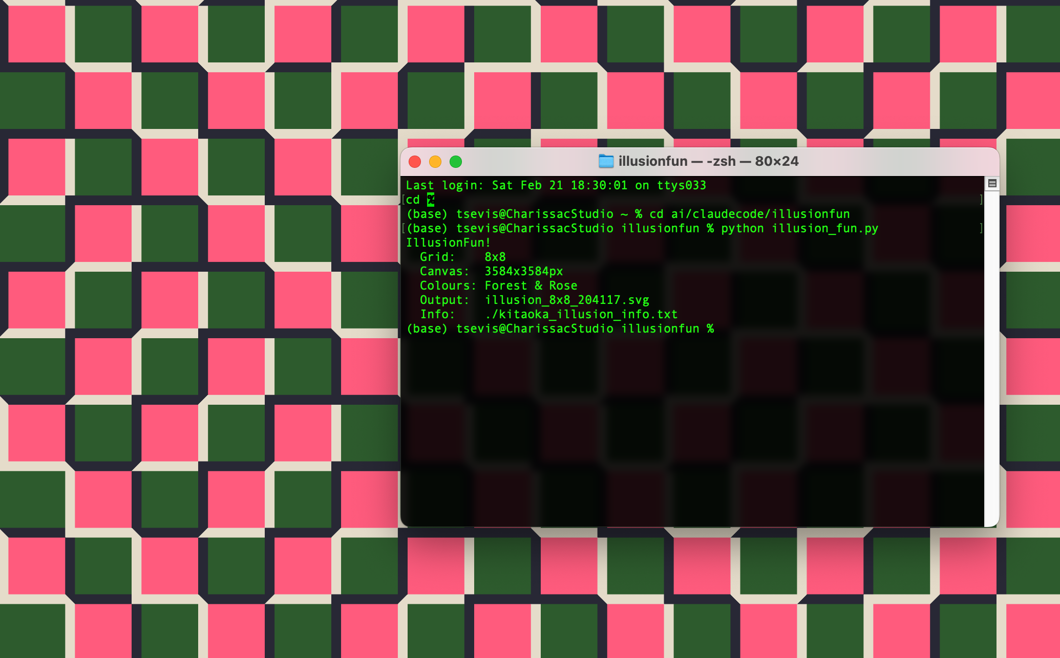 Running the IllusionFun script to generate a "Forest & Rose" Kitaoka optical illusion, an 8x8 grid creating a mesmerizing 3584×3584px pattern of alternating green and pink squares.
