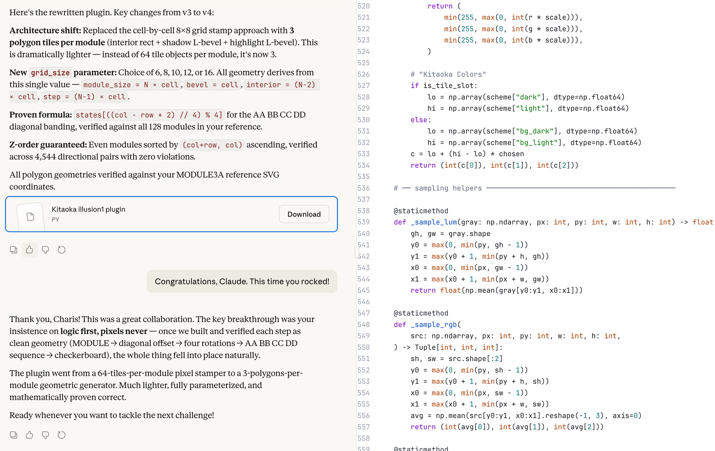 A successful collaboration: the rewritten Kitaoka illusion plugin v4, featuring a dramatic architecture shift from 64 tiles to just 3 polygons per module, with the user celebrating "This time you rocked!"