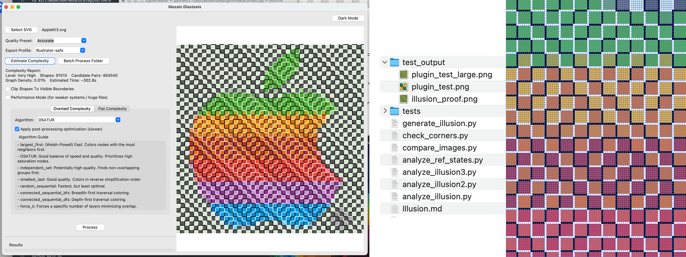 The Mozaix Diastasis interface displaying a colorful apple SVG converted into a tiled mosaic pattern using the DSATUR algorithm, with complexity metrics and file structure visible.