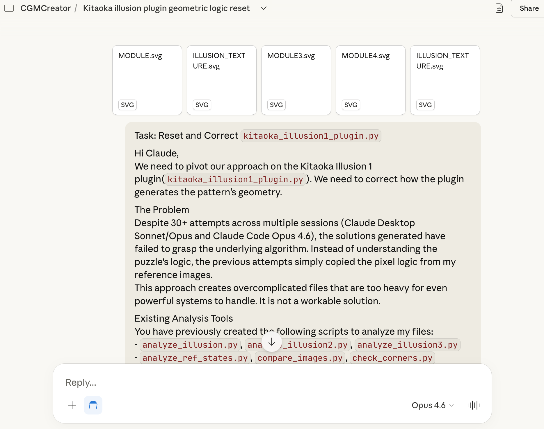 A developer's request to reset the approach on a Kitaoka Illusion plugin, explaining that 30+ previous attempts have failed to grasp the underlying geometric algorithm and instead created overcomplicated, unworkable solutions.