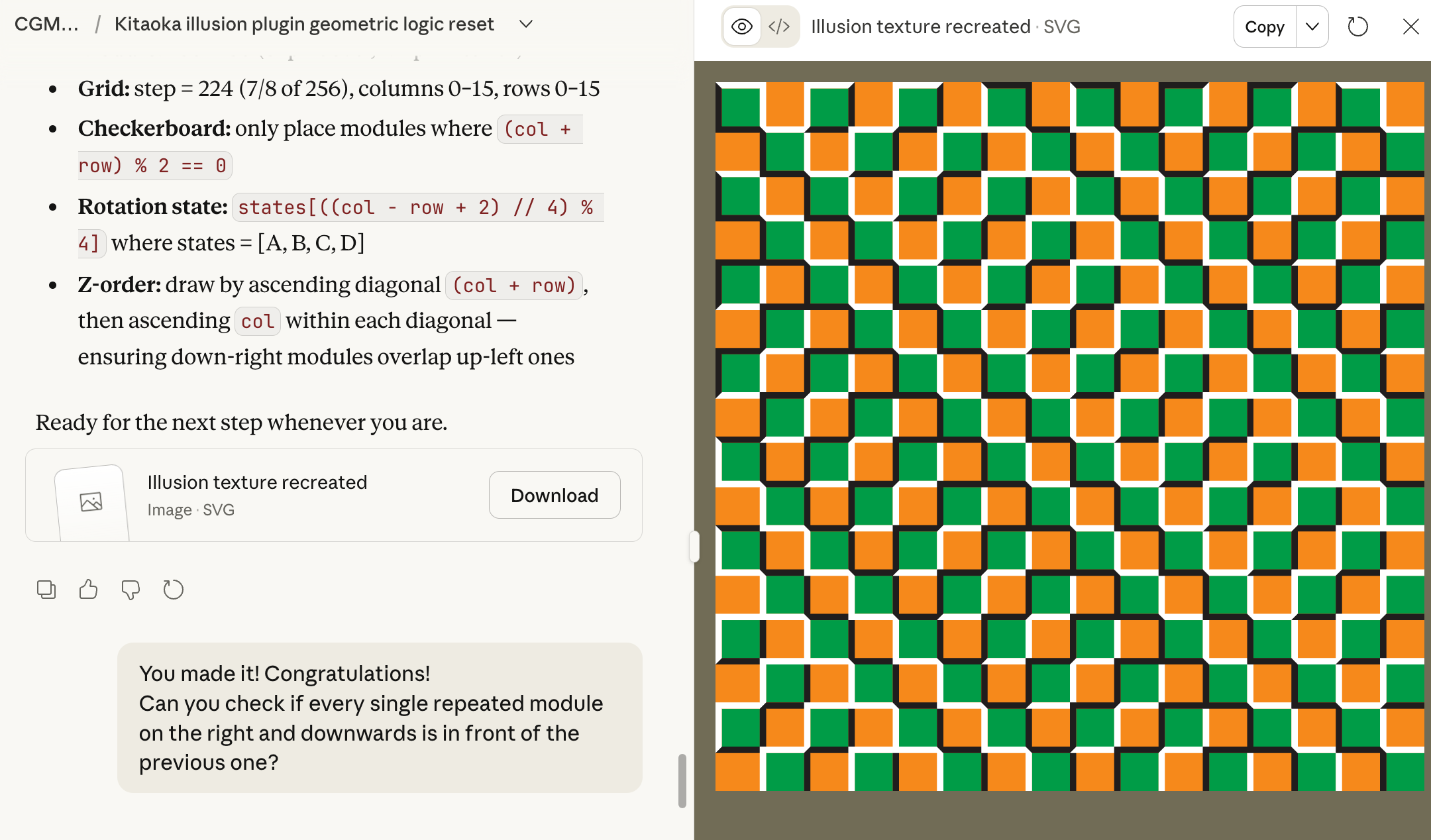 Success! The recreated Kitaoka illusion texture displayed as an SVG, with the AI asking the user to verify the layering order of the repeating modules.