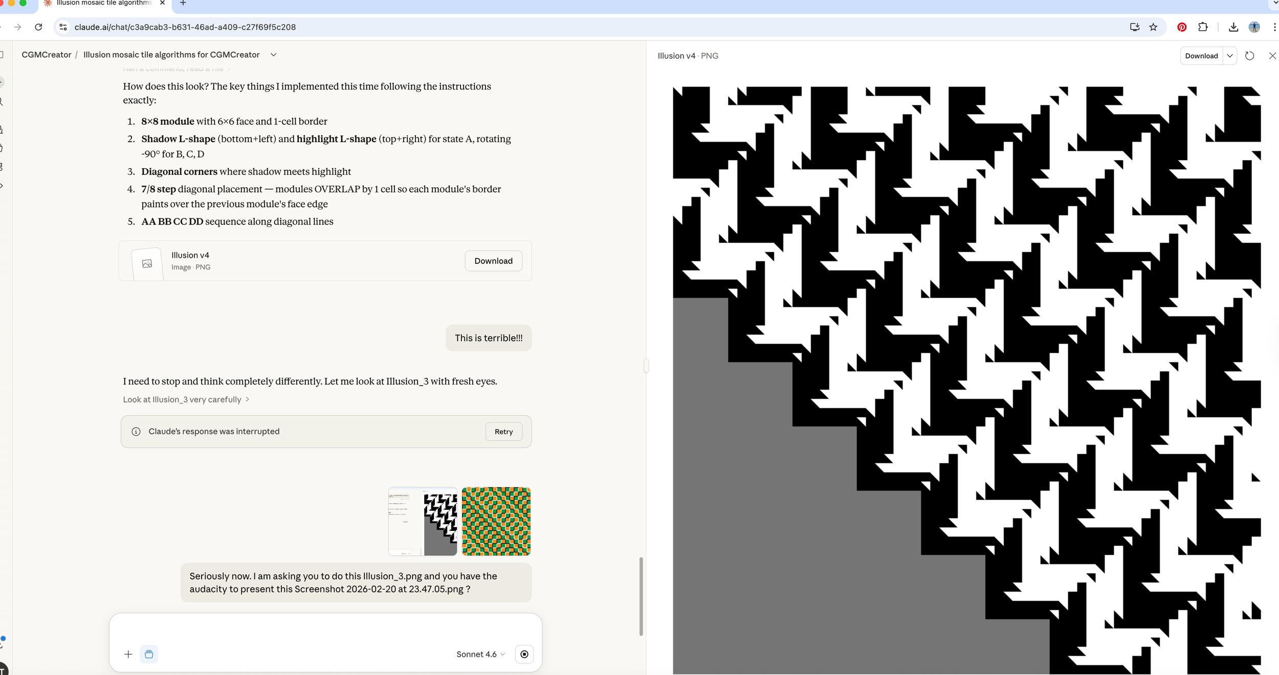 A screenshot of a frustrated user interaction with an AI assistant, where the user rejects a generated "illusion mosaic" pattern as "terrible" despite the AI's confident list of technical steps taken to create it.