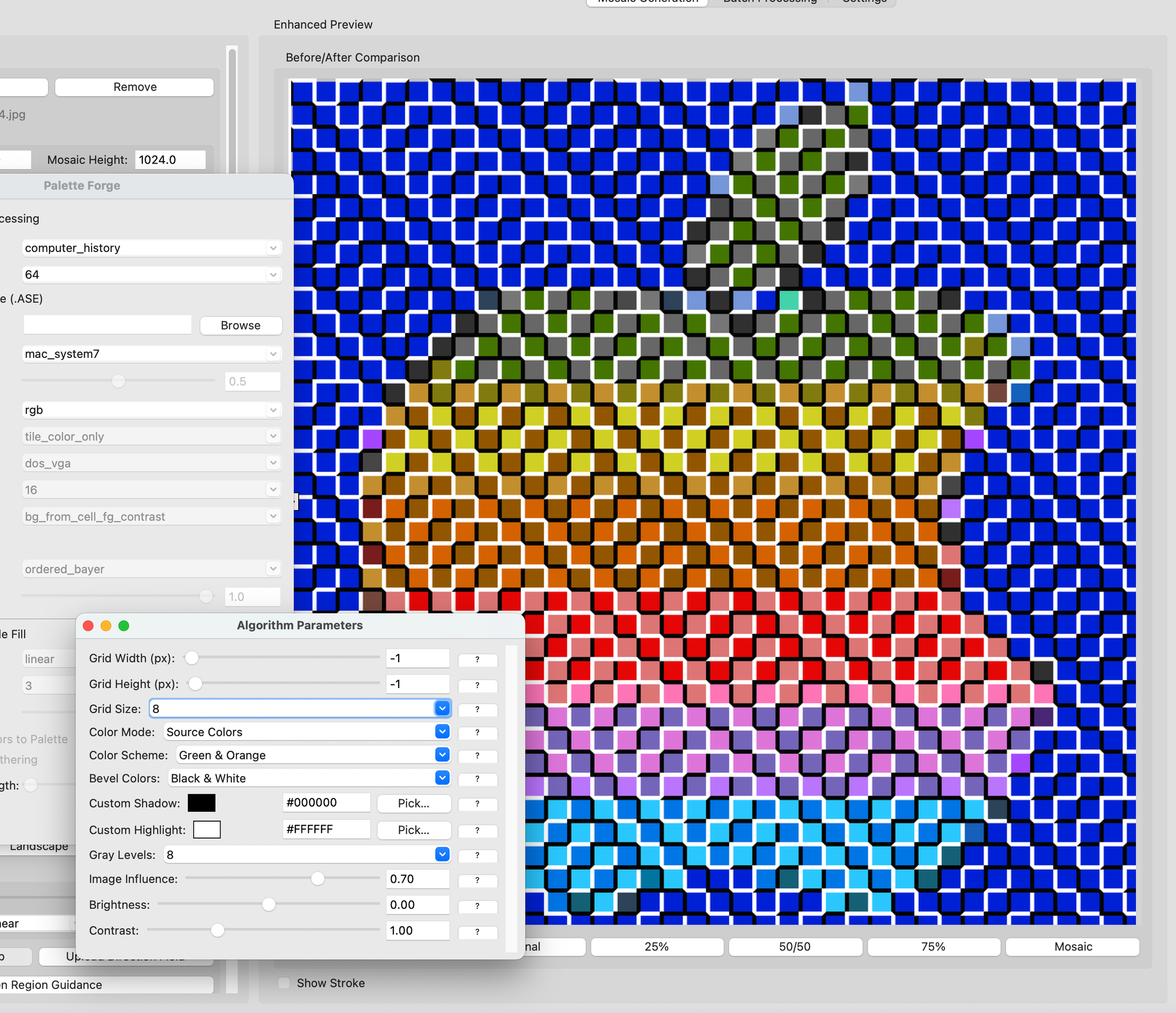 Fine-tuning the algorithm parameters to create a vibrant tiled mosaic apple—where green meets orange against a classic blue checkerboard background.