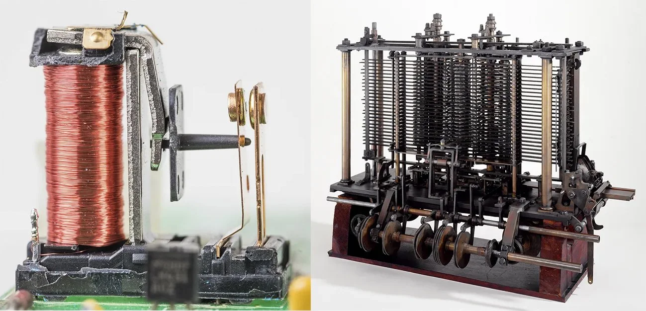 Before transistors, machines relied on electromagnetic relays. Pictured here are a single relay unit (left) and a sophisticated multi-relay assembly (right), similar to those found in machines such as the Harvard Mark I. (CC Wikipedia).